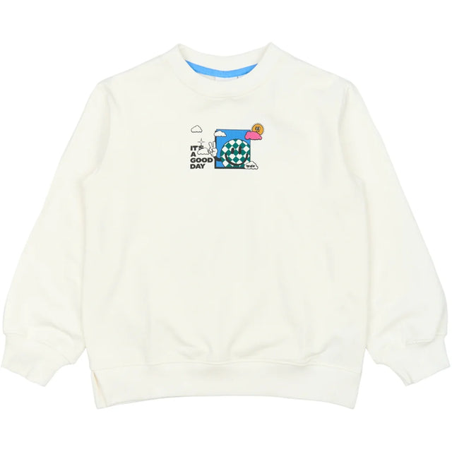 This sweatshirt from THE NEW is both colorful and positive with a unique print on the front showing a smiley with a checkered face, with a background of sky, sun and clouds. The text "It's a good day" adds an optimistic touch to the design. On the back of the sweatshirt there is a larger version of the same print, with an additional smiley and the text "every day", which reinforces the happy and positive expression. A perfect sweatshirt to spread good energy and create a relaxed but stylish look.