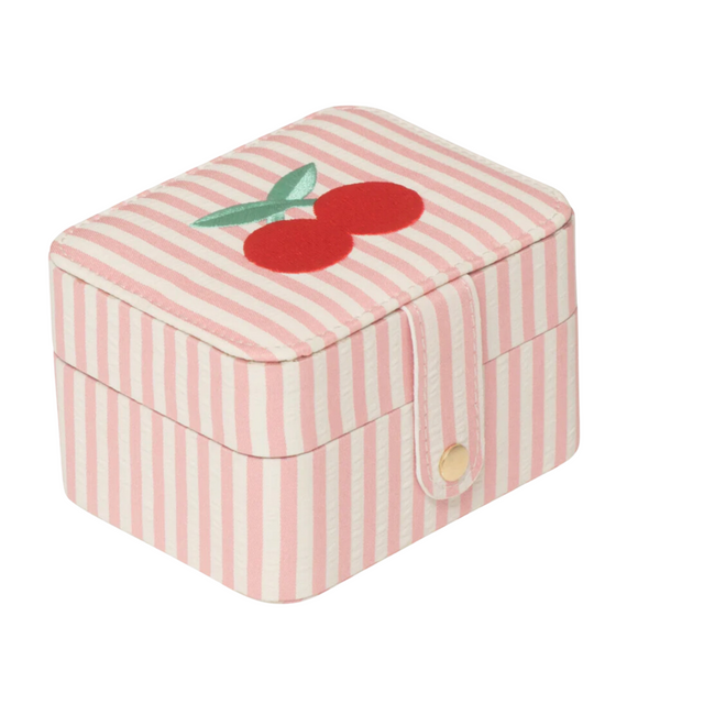 This sweet and stripy jewellery box is the perfect place to keep all your Rockahula jewellery and favourite treasures safe! Featuring a delicious embroidered cherry, this jewellery box has a popper fastening and opens to reveal four compartments, a slip pocket and a dedicated space to slot earrings and rings. Lined with our sweet cherry print fabric.