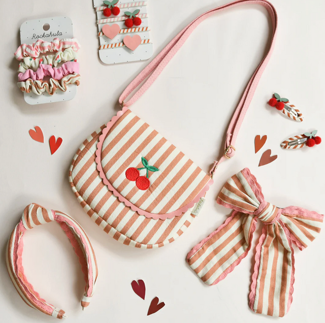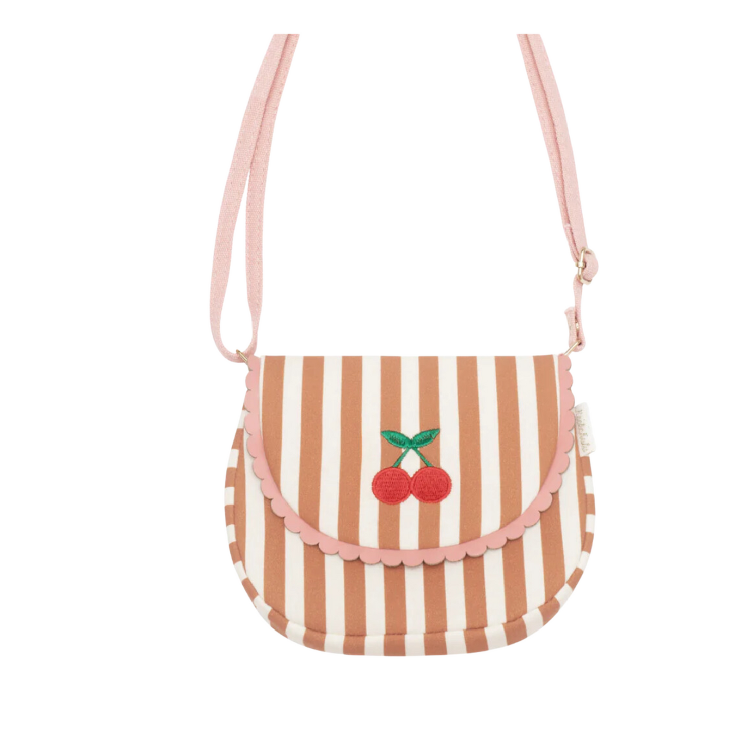 This gorgeous little bag is made from soft stripy fabric and is detailed with a sweet pink scallop and an embroidered cherry detail! Featuring a magnetic dot closure, a full lining and an adjustable pink strap with a break point for safety. Totally cherry-licous!