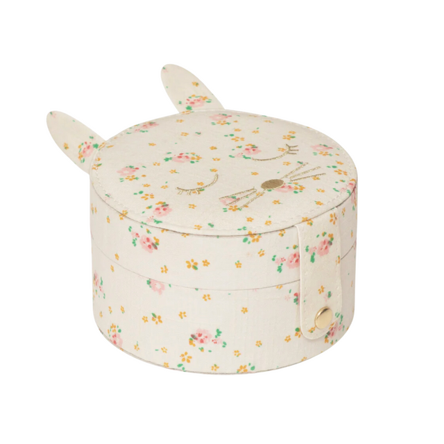 This cute bunny jewellery box is the perfect place to keep all your Rockahula jewellery and favourite treasures safe! Featuring a gold embroidered bunny face, two floppy ears and made in our beautiful tiny blossom fabric, it opens to reveal three compartments, a slip pocket and a dedicated space to slot earrings and rings. Lined with sweet stripy fabric.