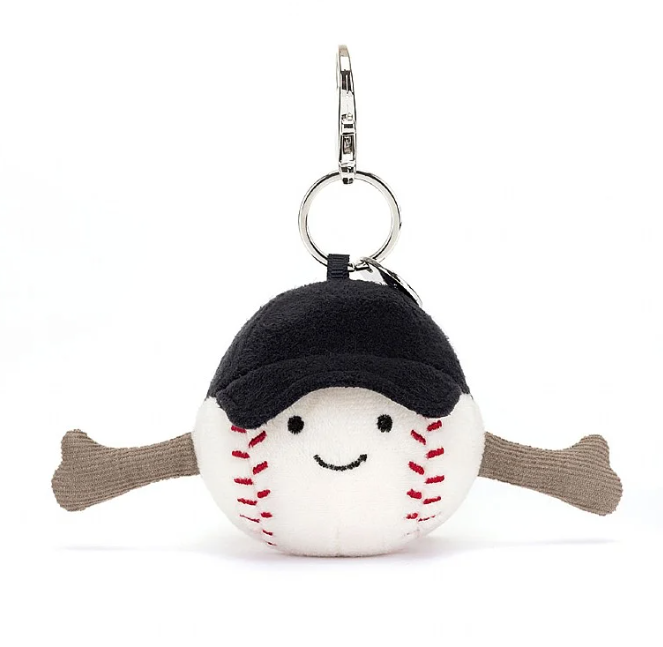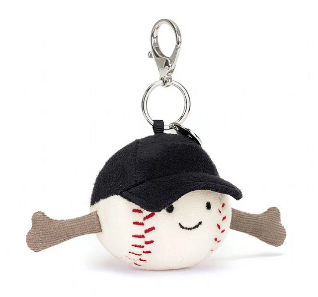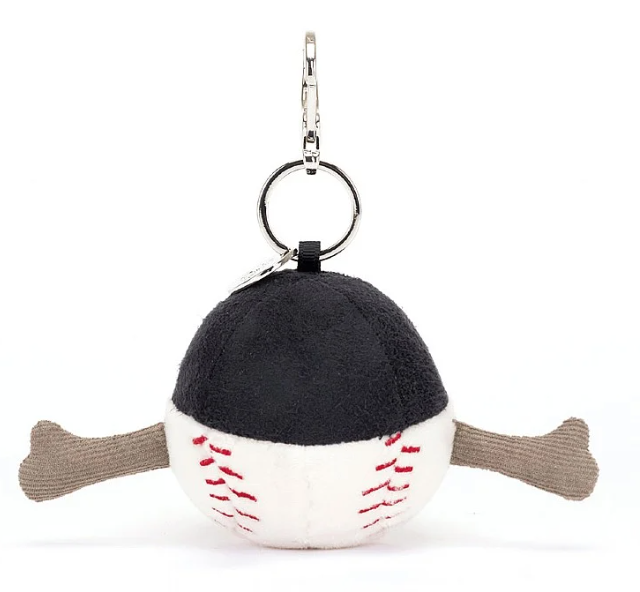 Amuseables Sports Baseball Bag Charm is the perfect game day companion in soft cream fur. With red stitching detail and a navy cap, this baseball has a silver claw clip and Jellycat tag perfect for any purse or backpack. The perfect gift for any baseball fan.