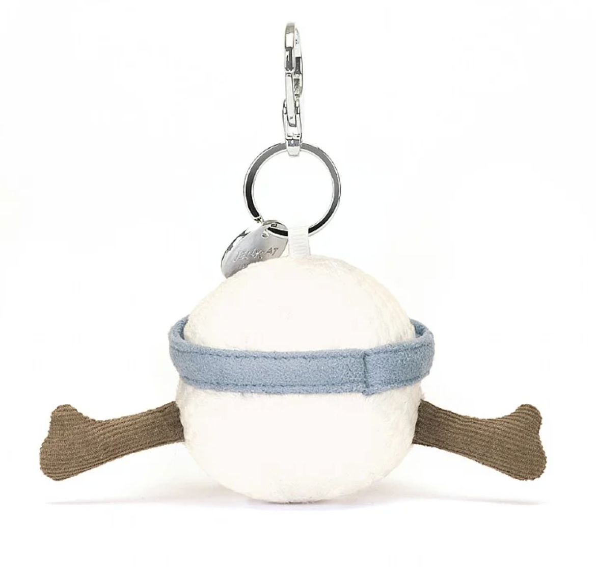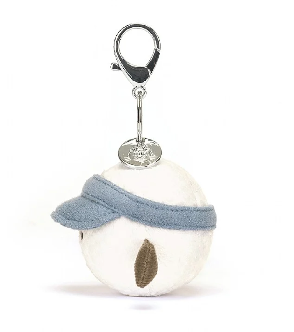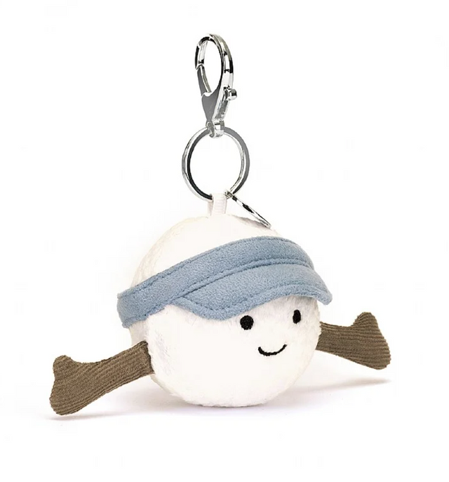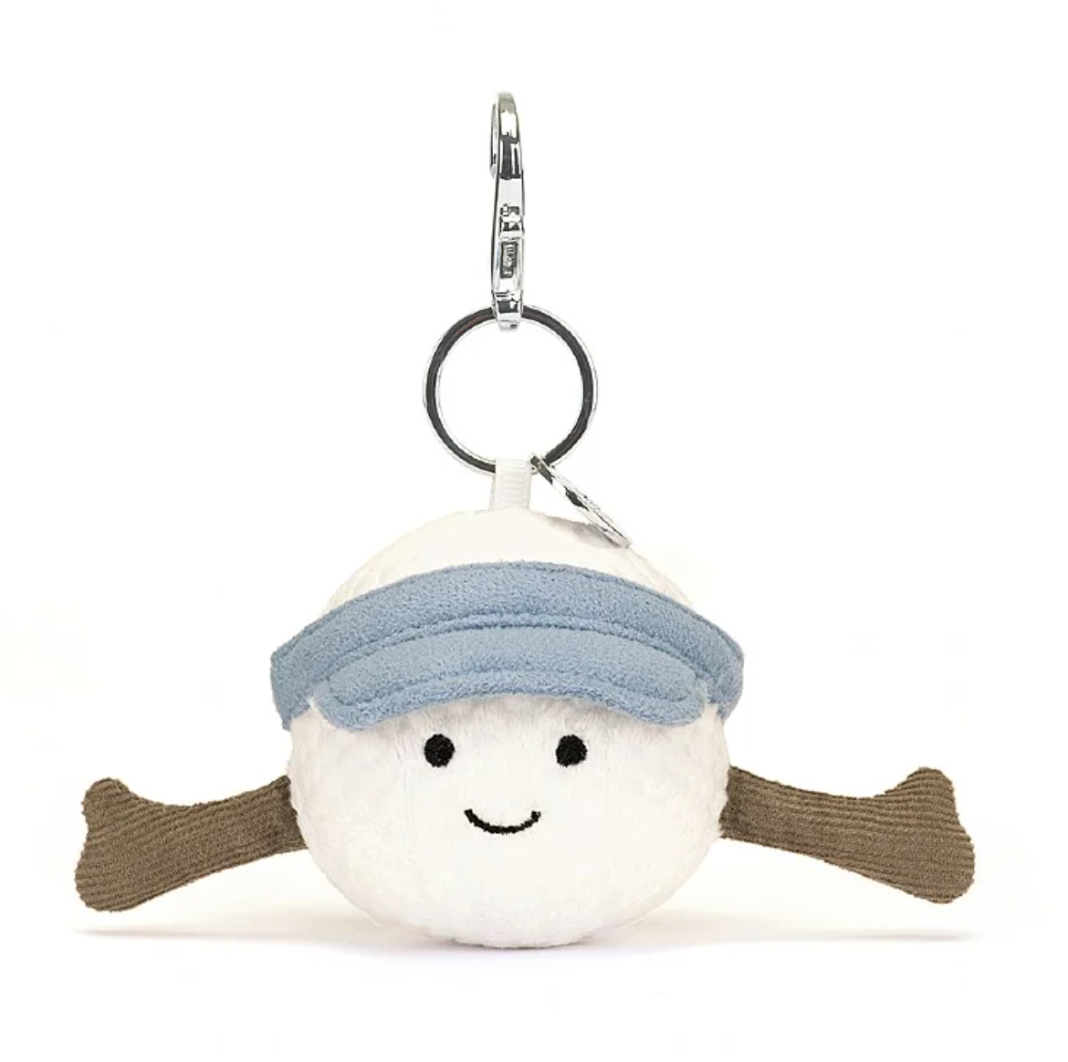 Amuseables Sports Golf Bag Charm is the perfect game day companion in textured cream fur. With a blue visor and a fine cord thumbs up, this golf ball has a silver claw clip and Jellycat tag perfect for any purse, backpack, or golf bag. The perfect gift for any golf fan.