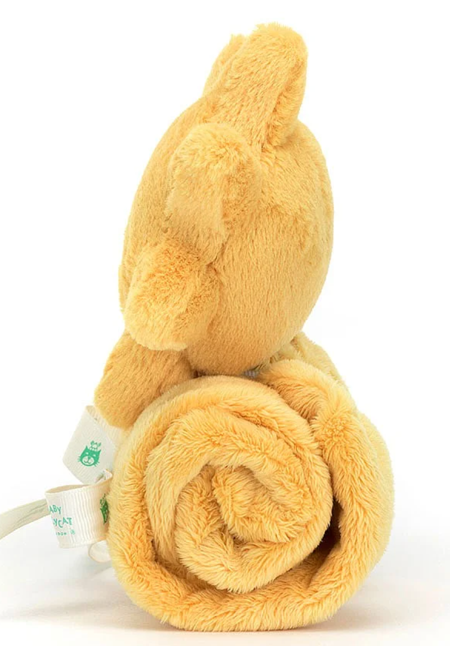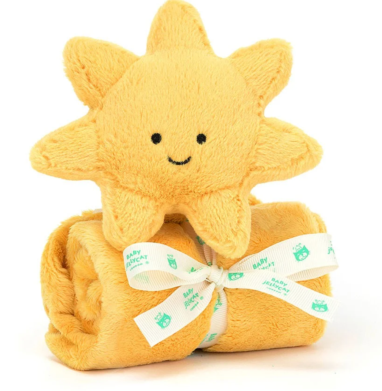 The Amuseables Sun Soother is a bundle of warm cuddles, rolled up and presented in a Baby Jellycat grosgrain ribbon. Both golden sun and soother are made with the softest recycled fibres. With cheery embroidered eyes and smile to brighten every day, it makes for a perfect newborn gift.