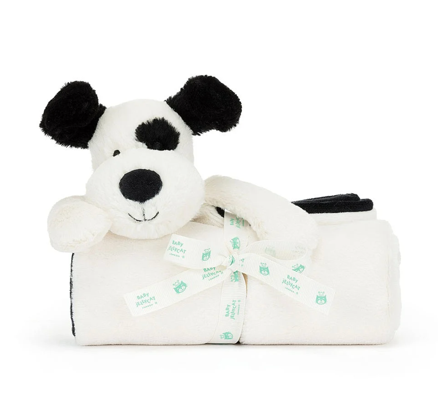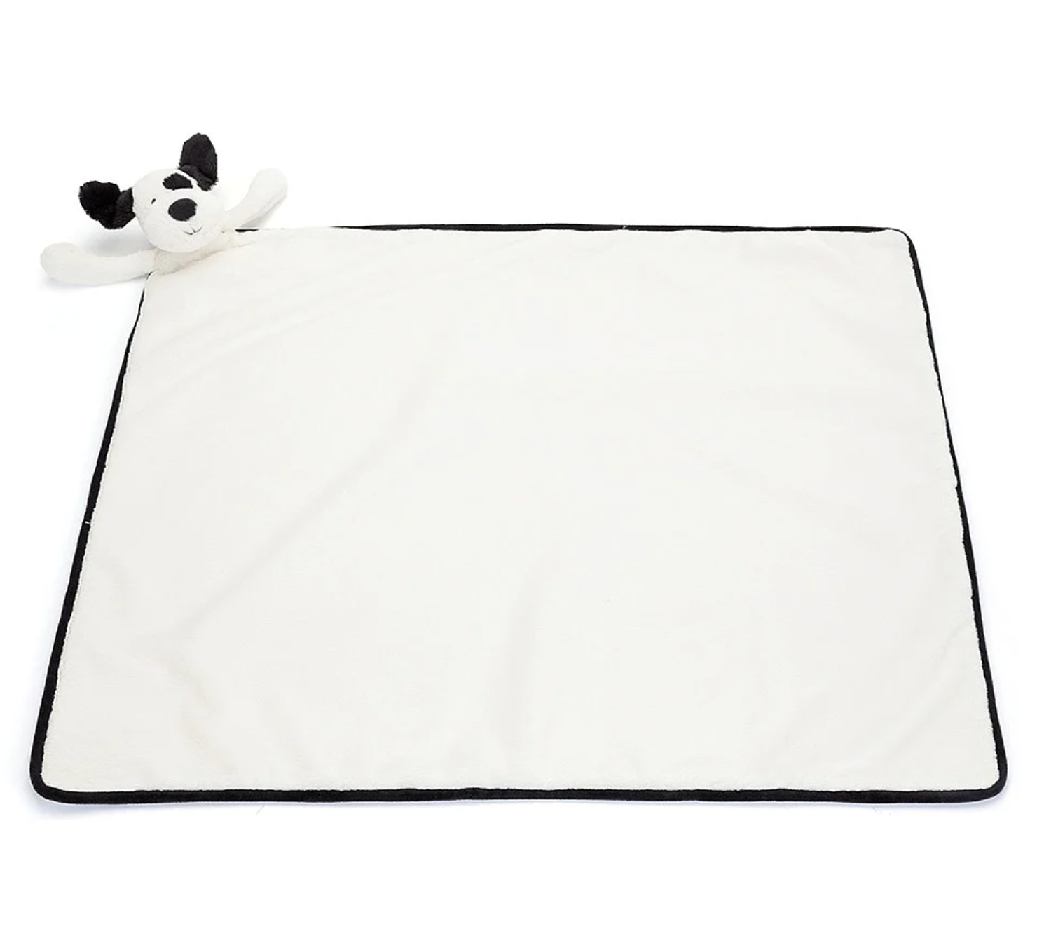Jellycat Bashful Black & Cream Puppy Blankie is backordered and will ship as soon as it is back in stock.