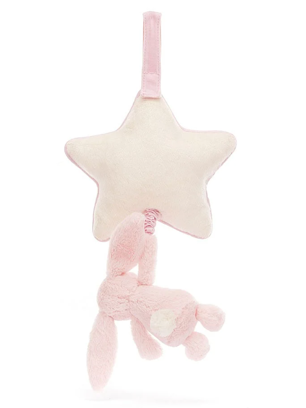 An enchanting newborn gift, let babies dream sweetly with a Bashful Pink Bunny Musical Pull. Our most loved Bashful Bunny, in soft, pink fur made from recycled fibres can be gently pulled to hear an original Jellycat lullaby. The cream star shaped musical pull with contrast trim can be attached to a crib or pram with a Velcro fastening.