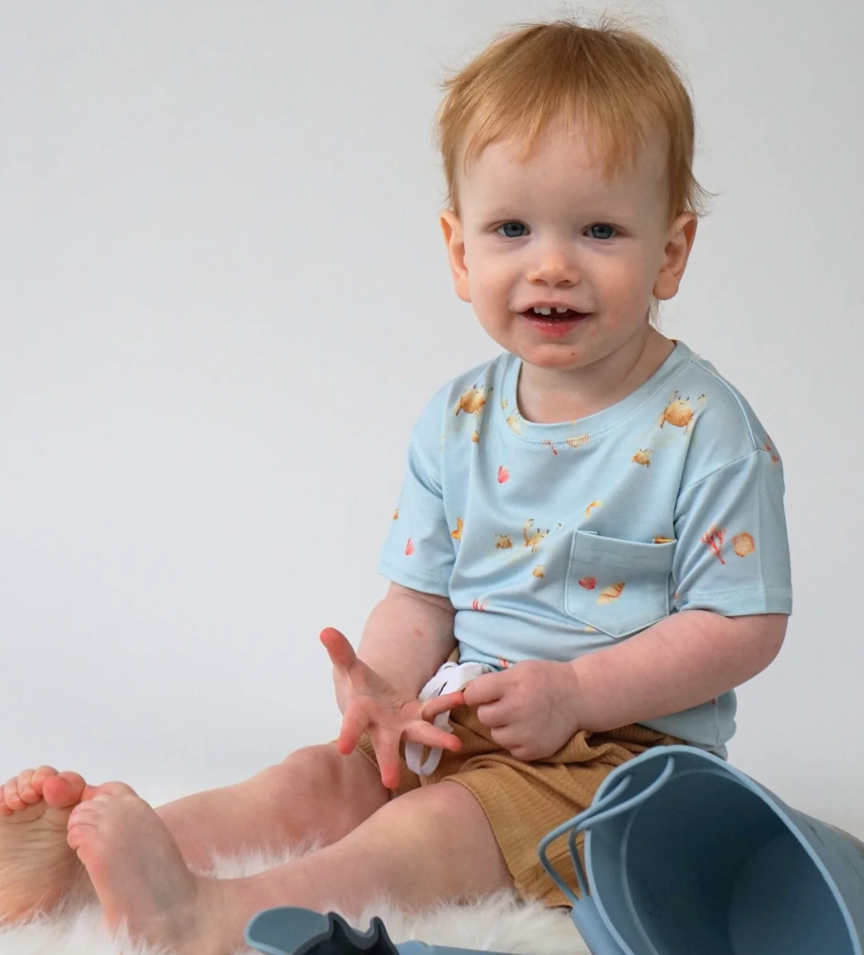 Fabric has been digitally printed with our custom Seaside print featuring cheerful crabs, star fish and other tide pool finds on a light blue background.