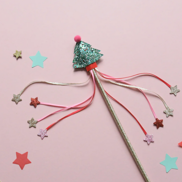 Wave this magical wand and spread some Christmas cheer! Our gorgeous glittery Christmas tree features a pom pom tree topper, and is adorned with beautiful coloured grosgrain ribbons with magical star detailing. The perfect wand for imagination adventures or a fun addition to the dressing up box!