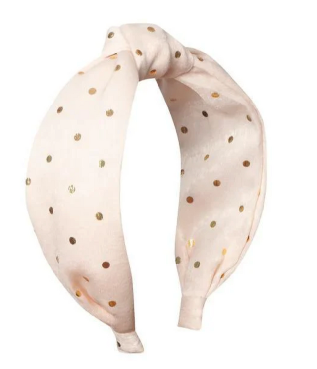 This spotty wide headband is made from the softest satin fabric with gold foil spots and features a twisted knot. This headband is made for a comfortable fit for little heads!