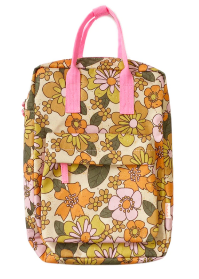 Get out and about with all your essentials in our gorgeous retro floral rucksack! This rucksack has vibrant bright pink carry handles, a front zip pocket and adjustable straps.