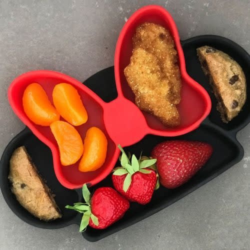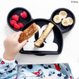 Our Disney Mickey & Minnie Mouse Dishes are perfect for little ones learning to self-feed. This divided plate is perfectly sized for toddler portions. A strong suction base ensures the dish stays put – even with the most aggressive toddler! Great for use on highchair trays or tables. Silicone can withstand low and high temperatures, easily transitioning from the refrigerator or freezer to the oven or microwave. Made with 100% food-safe silicone that’s durable, stain and bacteria resistant. Measures approximately.