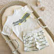 Make every day extra fun with this Dirkje set for boys. This cheerful set consists of an off white melange loose fit T-shirt, featuring a sweet crocodile on the front. The matching boys' shorts, also in off white melange, has a cheerful crocodile print, an elastic waistband and cool side pockets. Made from soft and breathable fabrics, this set offers a perfect blend of comfort and style for your little one.