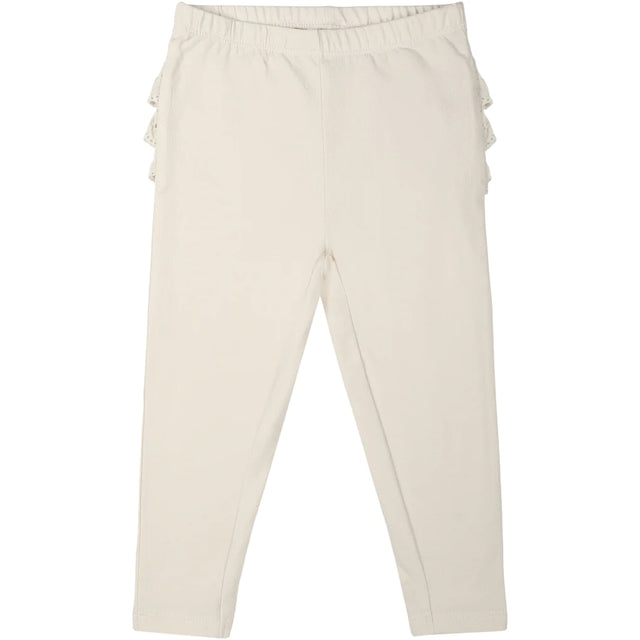 Solid white baby leggings with broderie anglaise ruffles at the seat. These feminine leggings from THE NEW siblings are daily essentials made of organic cotton to avoid harmful chemicals and ensure that they are soft and breathable. We have also added 5% stretch to ensure free movement and comfort for your child to play and explore.