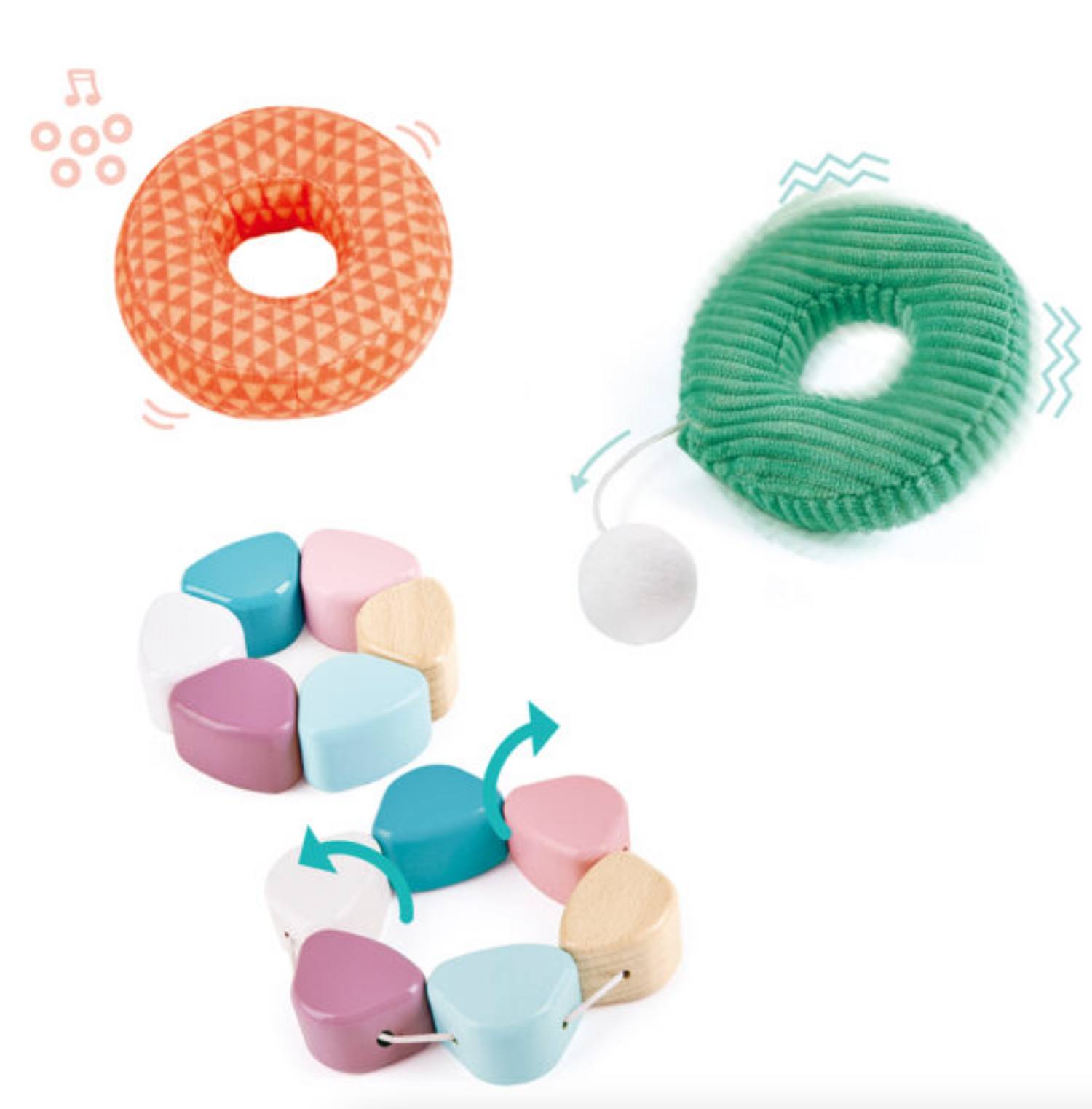 - Includes one flower ring with six petals which you can flip and play with, one pink ring with pleasant jingles, one which features a pull-out string tail that clicks cutely and a wobbling base