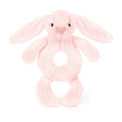 A treat for tiny hands, Bashful Cream Bunny Ring Rattle can be grabbed by its soft paws, long lop ears or ring-shaped tummy. When given a gentle shake it will sound the rattle inside, much to baby’s delight! Crafted in a cream colored fur made from recycled fibers featuring a Bashful Bunny pink suedette nose and embroidery eyes.