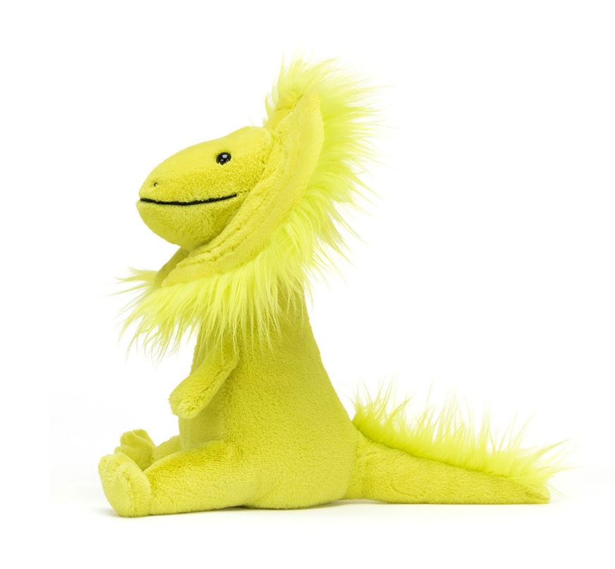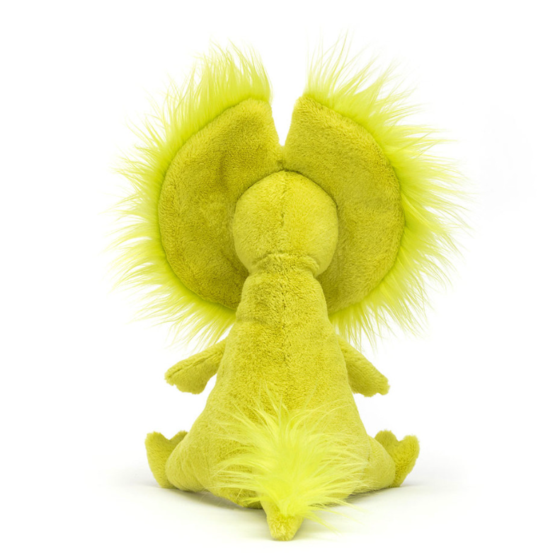 Goofy-gorgeous in zingy citrus green, it's Davey Dilophosaurus! This sassy scrambler has a very fine frill with stitchy ring detail and fluffy edging. A bright-eyed bestie with a huge dorky smile, long fuzzy tail and diddy paws, Davey's downright reptastic! Anyone got any fizzy bugs?
