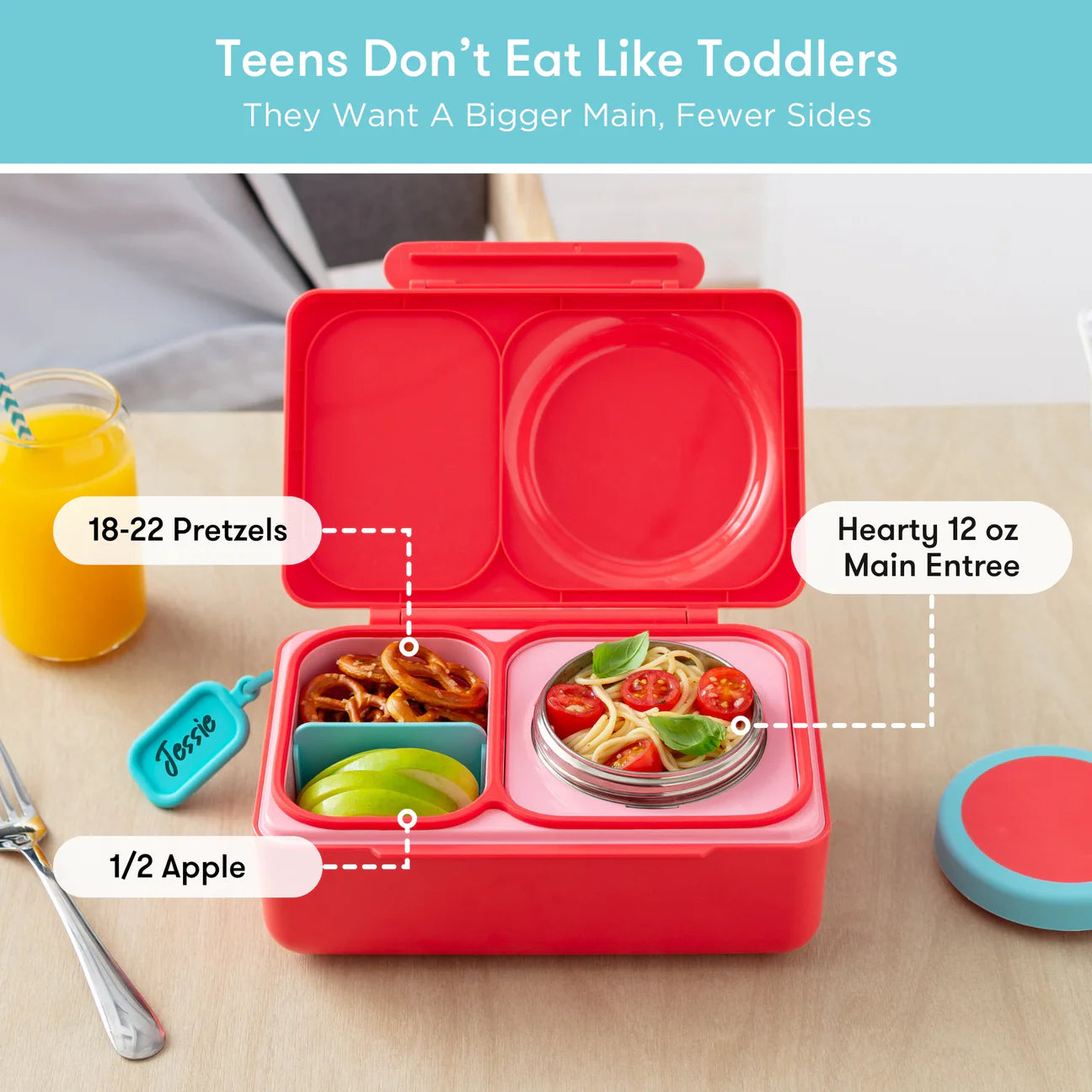 OmieBox UP is a hot-and-cold bento box built for big kids. Big kids want a real meal: one big main plus something on the side. That’s why it has a 12oz thermos for a hearty entrée and a roomy side compartment for fruit or chips. It’s all packed into a sleek, grown-up design that keeps food at the right temperature - hot and cold!