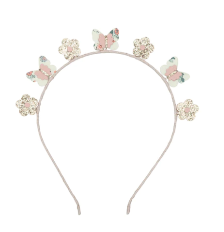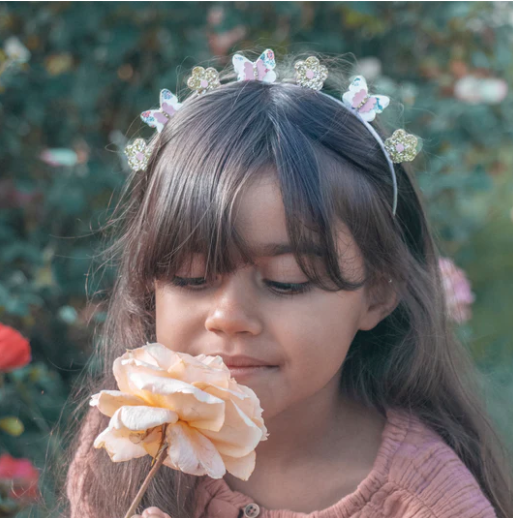 Our flora butterfly headband is adorned with the sweetest butterflies in our flora print, and shimmering gold glitter flowers. Sat upon a mink ribbon wrapped metal headband. The perfect headband for those sunny spring days chasing butterflies!