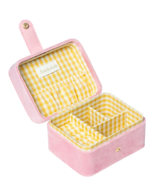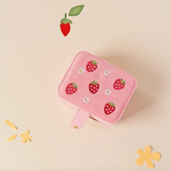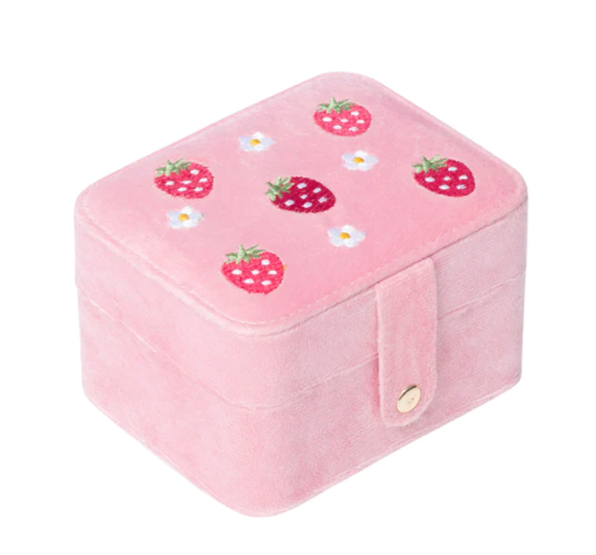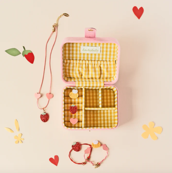 Our gorgeous super soft velvet jewellery box is the perfect place to keep all your Rockahula jewellery and favourite treasures safe! Featuring a beautiful embroidered strawberries and daisies on top and fully lined in our gingham fabric, this jewellery box has a popper fastening to reveal four compartments, a slip pocket and a dedicated space to slot earrings and rings.