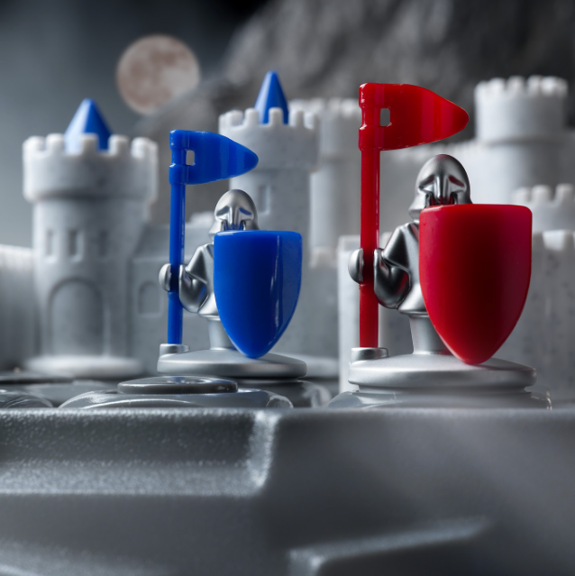 Can you arrange the walls on the game board to protect the blue warriors within the castle and keep the red invaders out?