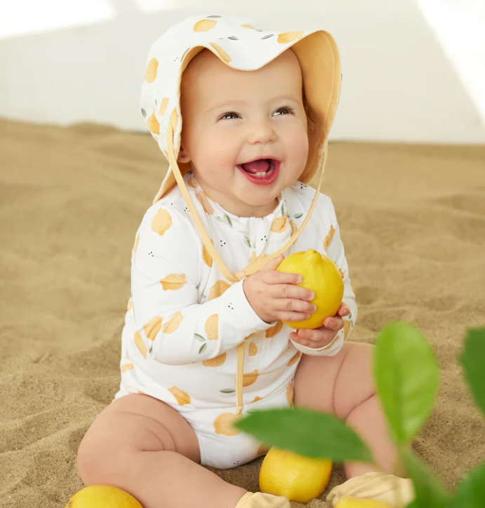 When life gives you lemons, dress the kids in the most adorable rash guard set! This playful set with all over lemon print just screams summer fun. With a long-sleeved rash guard, and high waisted pants, the set protects them from chilly waves and sunny rays. The rash guard is made from stretchy, recycled nylon with built-in UPF50+ sun protection and zips down the front which makes it easier to remove. The pants have a frilly trim on the legs to add to the fun, and there’s matching swimwear for olding siblings, mom and dad.