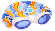 Our Blaze swim goggle features our tangle-free strap in a blue and orang flame print on a light blue background paired with white frames and lightly tinted blue lenses.