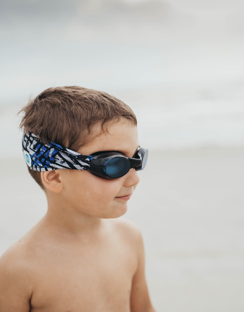The Maze swim goggle features our tangle-free strap in a black, blue and gray abstract print. Paired with a black frame and lightly tinted blue lenses.