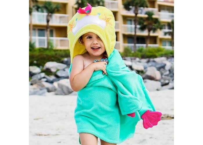 Wrap your little ones in our luxuriously soft and plush hooded towels! When it's time for a break from the water, our cozy hooded towels do more than keep little ones warm and dry after the Bath, a dip in the Pool or on the Beach. Our unique design details such as hand grabs, paws, tails, fins and feathers offer kids an unexpected opportunity for costumed imaginary play. Loomed from 100% Cotton Plush Terry, our towels will keep off the chills and delight your child with their plush softness.