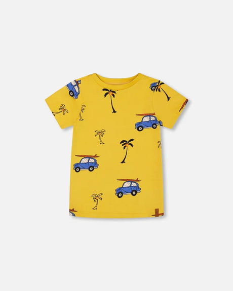 Deux Par Deux Printed Organic Cotton Tee Yellow And Blue Car