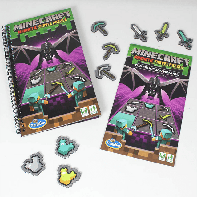 Solve the challenges and advance on your journey, using your most powerful weapon—YOUR BRAIN! In this mind-bending game of deductive reasoning, players use positive and negative visual clues to place magnetic Minecraft weapons and armor on the Crafting Table in the correct arrangement. When your arrangement includes all the Clue Patterns on the Challenge—YOU WIN!