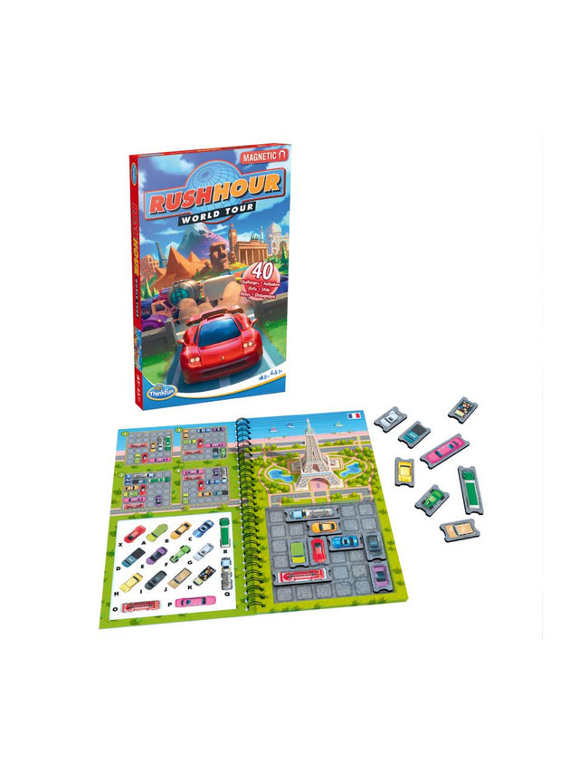 ake all the fun of Rush Hour all around the world! As you travel to your next destination, explore the major monuments and wonders of the world as you guide the red car out of the traffic jam. Enjoy amazing illustrations of historic locations as you play through the Rush Hour experience with the magic of magnets. With 40 challenge cards of increasing difficulty, kids will be engaging their brains on every car, plane, and train ride to new places.