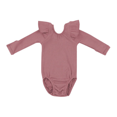 Kyte Baby Ribbed Long Sleeve Ruffle Leotard in Dusty Rose