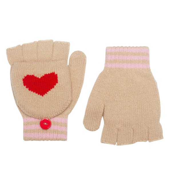 Fall in love with our sweetheart knitted mittens. Adorned with a bright red love heart, these fingerless gloves have a fleece lined cap which can be secured with a button when not in use, and an enclosed thumb. Available in sizes 3-6 years and 7-10 years.
