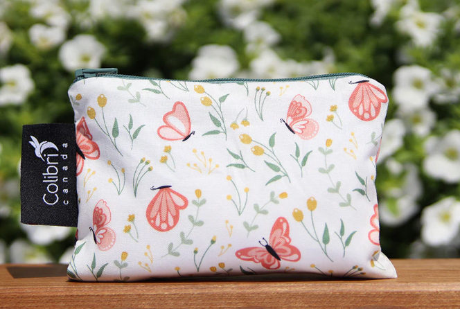 7.5 x 7.5 inches, made in Canada with 100% cotton outer, 100% polyester with polyurethane membrane (PUL) and YKK zippers that are lead, nickel free and tested to meet CPSIA standards.