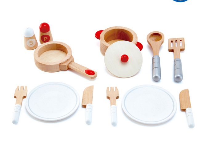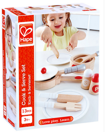 With the Cook & Serve Set’s wooden pot, pan, plates and accessories, your child has everything they need to cook a delicious meal for friends or family!