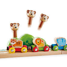 This rail set offers delights at every turn! A beautiful melody plays as you drive the jungle train over the xylophone track. Then cheeky monkeys pop up as you pass the bushes!