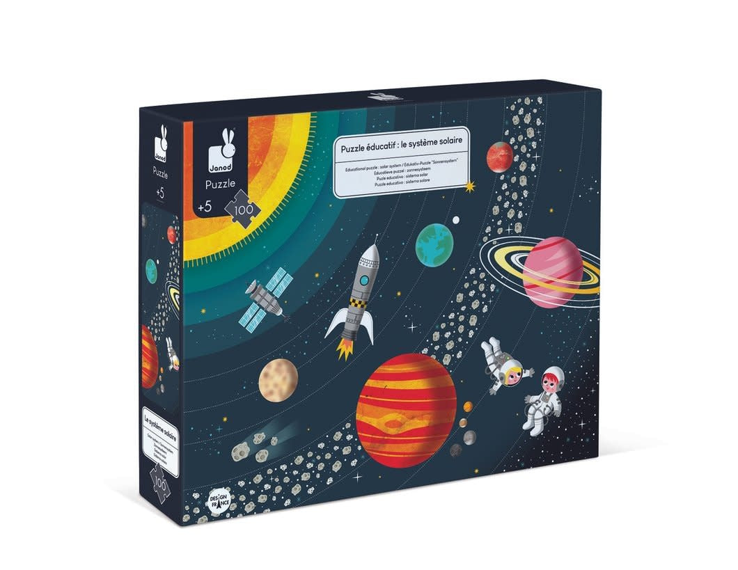 Aim for the Milky Way and to discover our solar system with this magnificent space-themed puzzle, suitable for children aged 5 years and up! This 100-piece cardboard puzzle is an invitation to escape into a world that mesmerises children! Comets, the sun, a few planets and beautiful details to discover in total immersion, thanks to this large-sized puzzle (70 x 49 cm). It comes with an educational booklet so your child can learn more about our solar system and its celestial bodies. As far as the style is concerned, this predominantly matte puzzle boasts varnish-finished planets to make them stand out and be easily identifiable. The box also contains a poster that serves as a model for beginners; the more experienced will soon thereafter be able to complete the puzzle by themselves. This product is made of FSC® -certified and other controlled material.