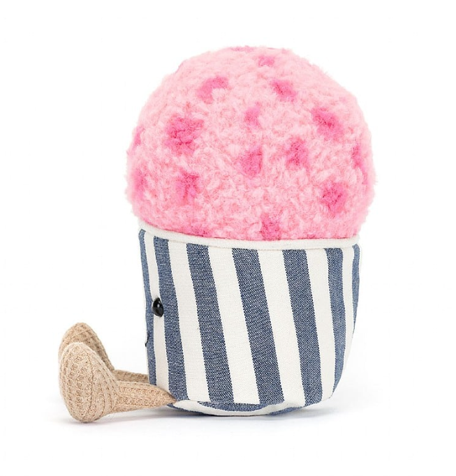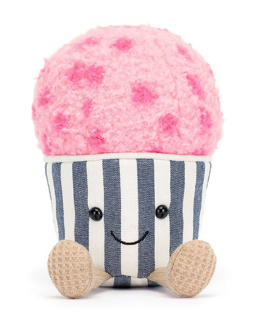 Say Ciao to Amuseables Gelato! A textured scoop of strawberry pink gelato sits in a blue and cream striped cotton cup. With waffle boots and a big, stitched smile, this sweet treat is molto bene!