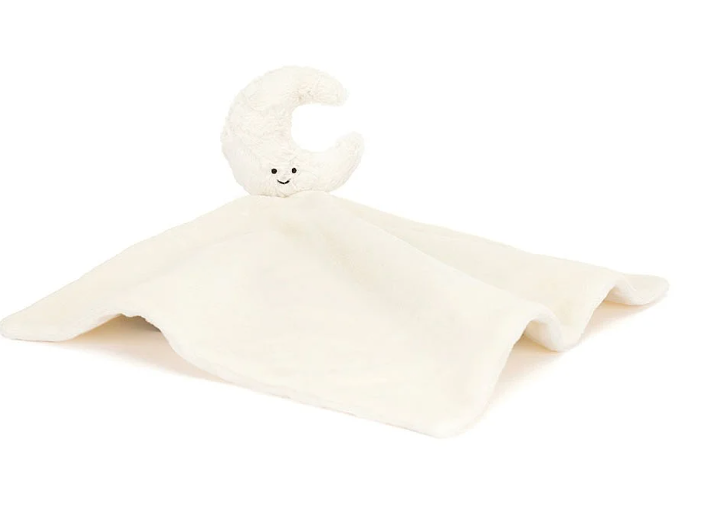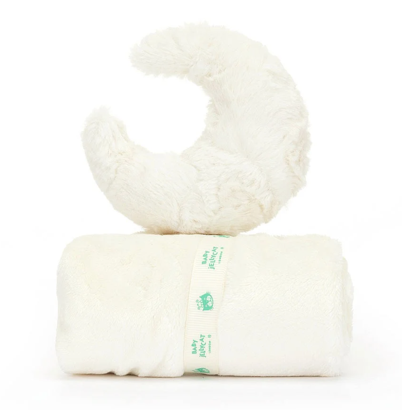 The Amuseables Moon Soother is beautifully textured in cream fur with embroidered eyes and cheerful smile. The crescent moon holds an irresistibly soft soother, made with recycled fibres. Rolled up and presented in a Baby Jellycat grosgrain ribbon, it makes a gorgeous gift for newborns, sure to bring smiles and cuddles.