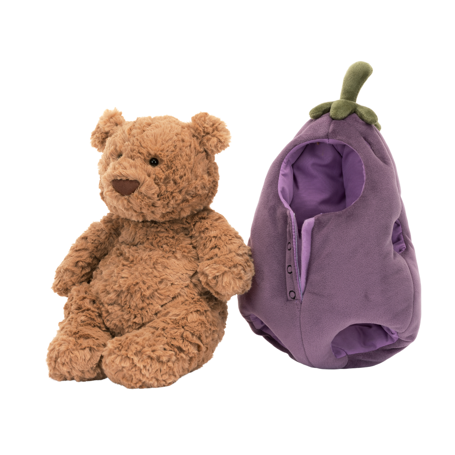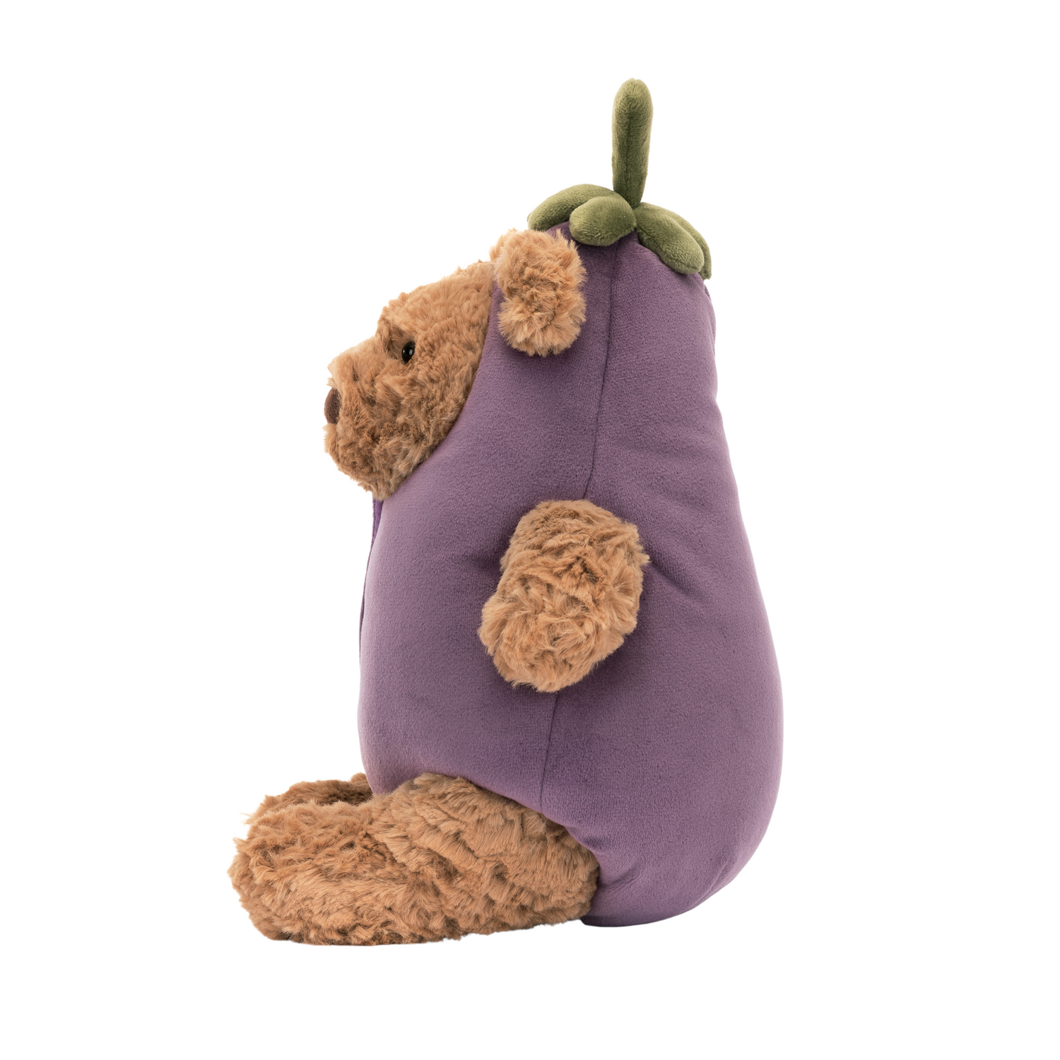 Bartholomew Bear Aubergine is all dressed up! Our toffee bear wears a purple suedette costume, fastened with velcro for easy removal. The veggie suit has stitched faux-buttons and the cute stalk hate even has ear-holes! A kooky gift for a veggie friend or any Bartholomew fan.