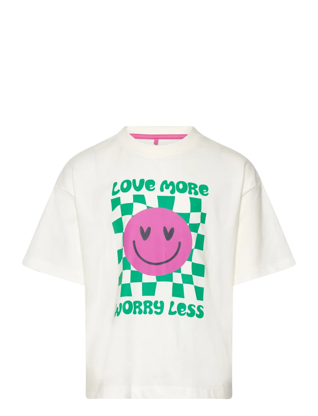 Oversized t-shirt from THE NEW with a front print featuring a checkered square design, a smiley, and the text "Love more, worry less." Available in two colors, this t-shirt is a stylish and uplifting choice for casual wear. Pair it effortlessly with jeans or shorts for a laid-back and trendy look. - Oversized fit - Front print - Round neckline - Short sleeves - Available in two colors- GOTS organic certified by CU842535