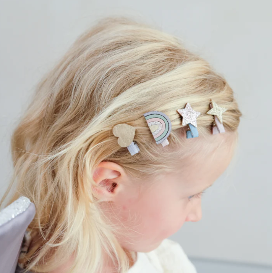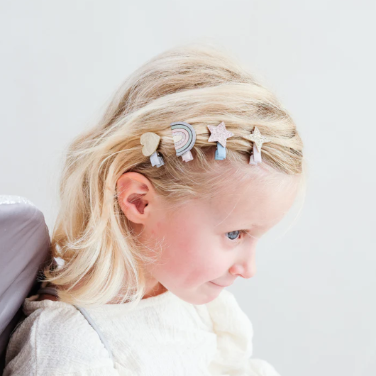 Float away with these super dreamy rainbow and cloud clic clacs! These beautiful little clips are sure to stay put while they're running around with their head in the clouds!