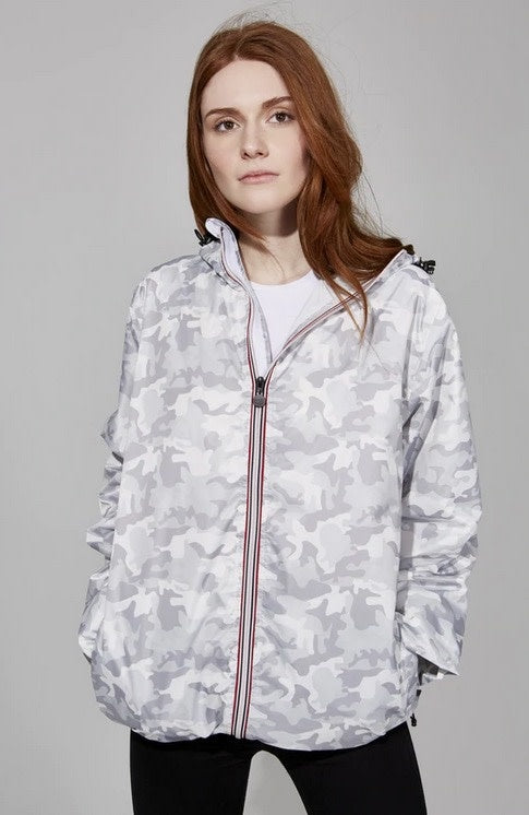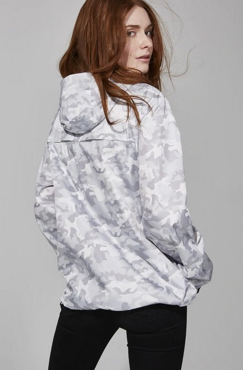 O8 Woman White Camo Full Zip Packable Rain Jacket-Sloane Print - S is backordered and will ship as soon as it is back in stock.