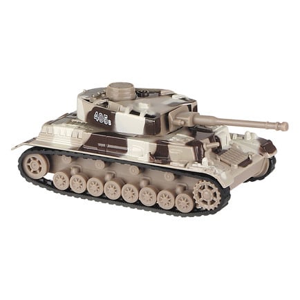 This 4.5in camouflage die cast tank has pull back action and a moving cannon.