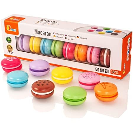 The set includes 8 macarons in different colors. Each one is made up of 3 pieces which are attached with velcro. Mix and match colors to achieve unique flavor combinations! A great complementary accessory for your imaginative play.