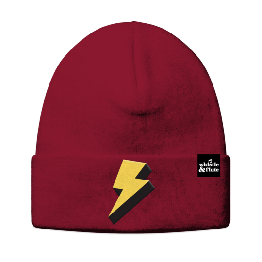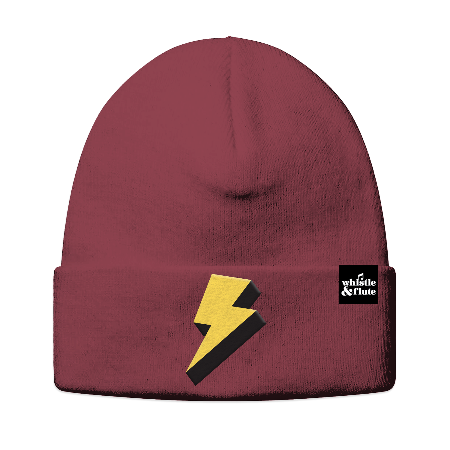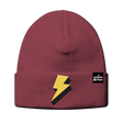 Electrifying Lightning Bolt design embroidered in yellow and black on a maroon beanie.